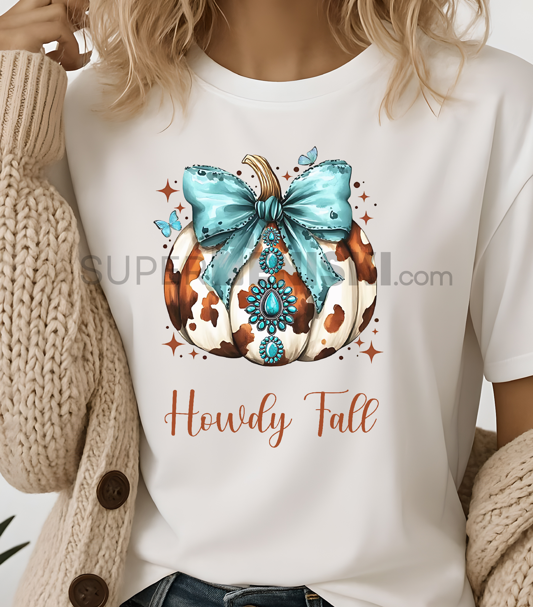 Дамска тениска с топъл акварелен принт, изобразяващ тиква със синя панделка и надпис „Howdy Fall. Идеална за есенния сезон!
