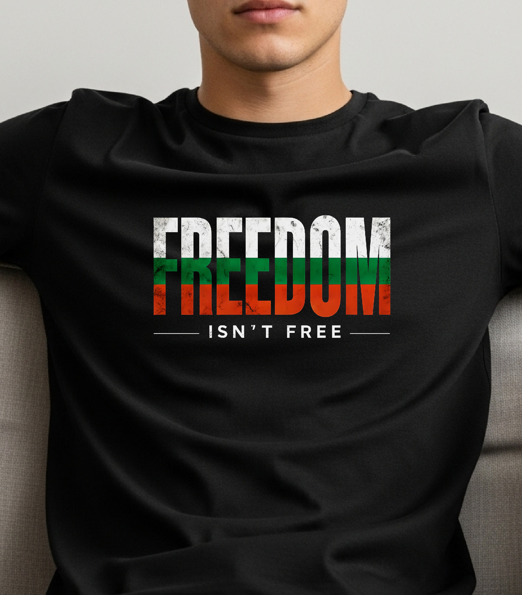 Патриотична тениска с българското знаме /бяло, зелено, червено/в текст „Freedom isn’t free“. Изрази любовта си към свободата с нашата тениска.