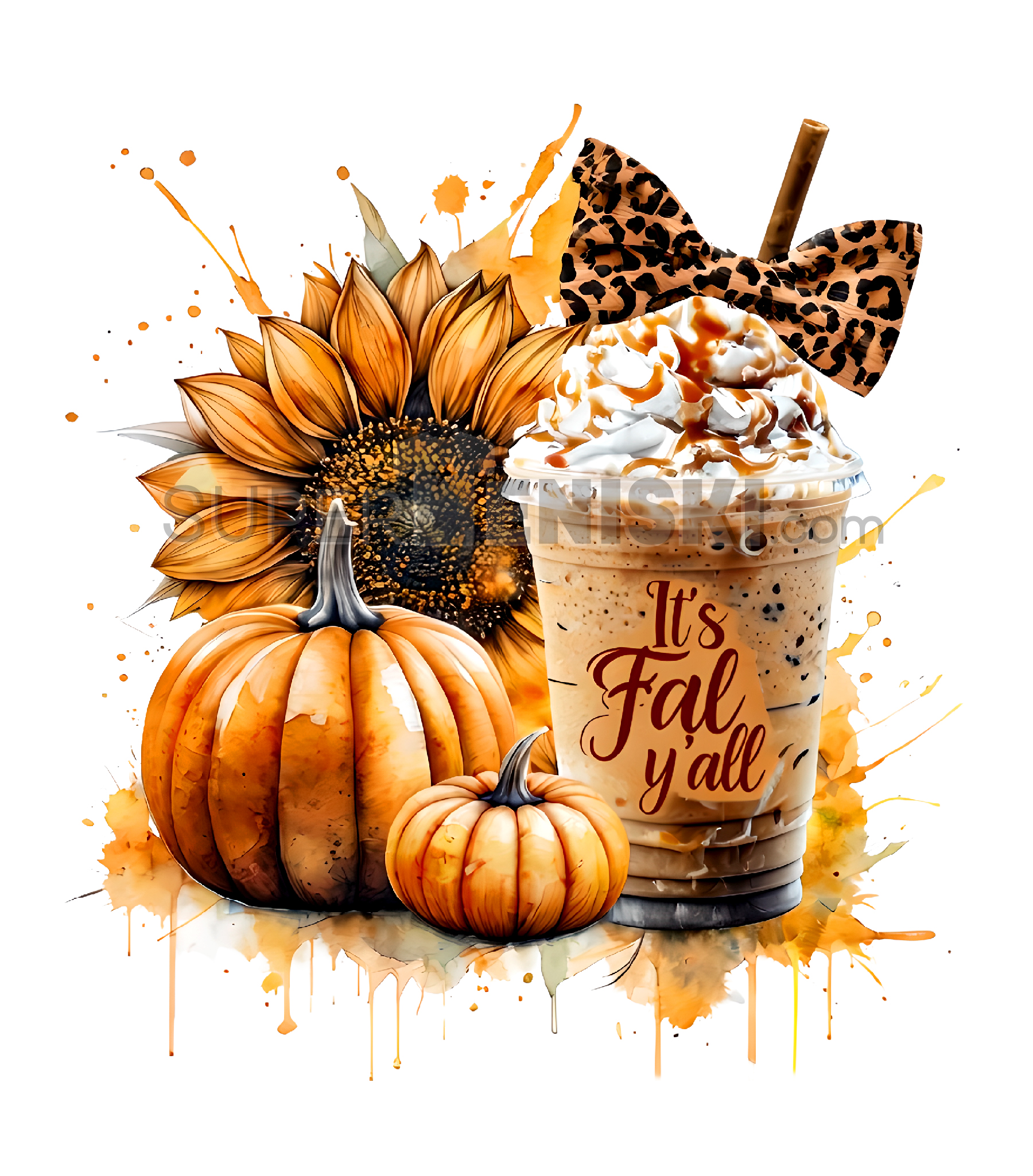 Дамска тениска с голям акварелен принт на есенна композиция: голям слънчоглед, две оранжеви тикви и чаша ледено кафе с леопардова панделка и надпис „It’s Fall y’all“.